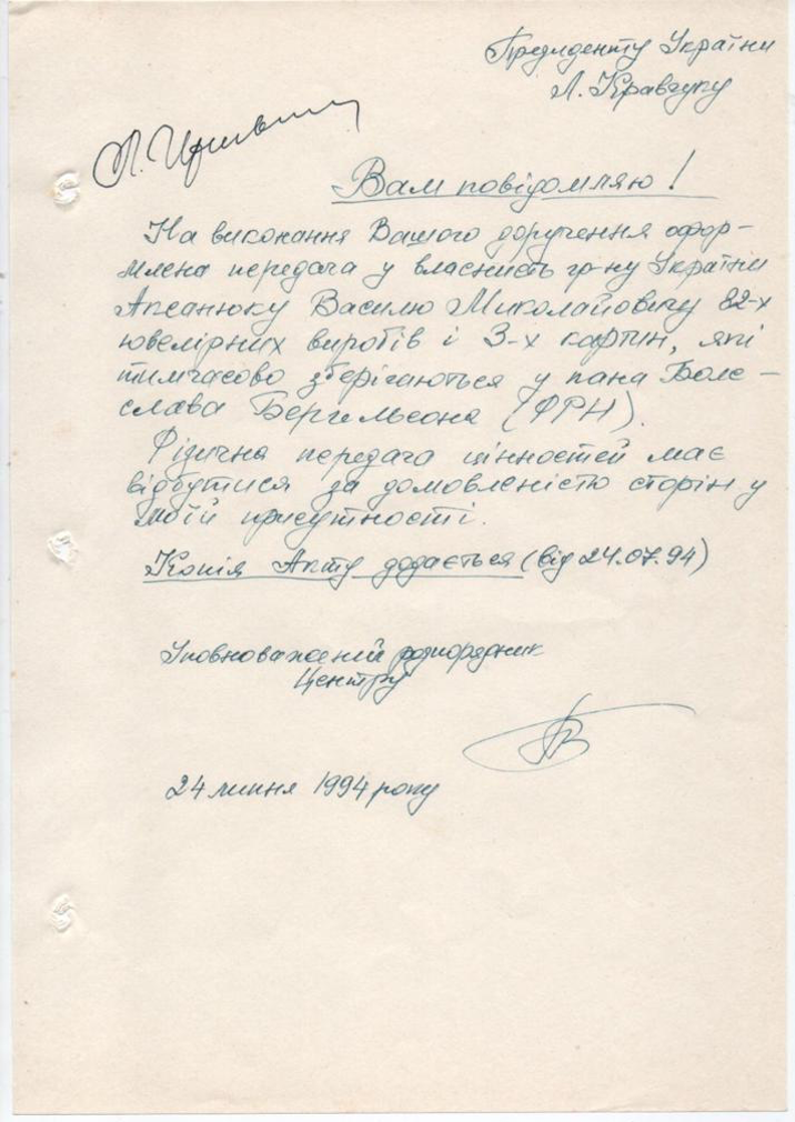Службова записка пана Паліводи Президентові України Л. Кравчуку щодо передачі колекції В. Аксанюку